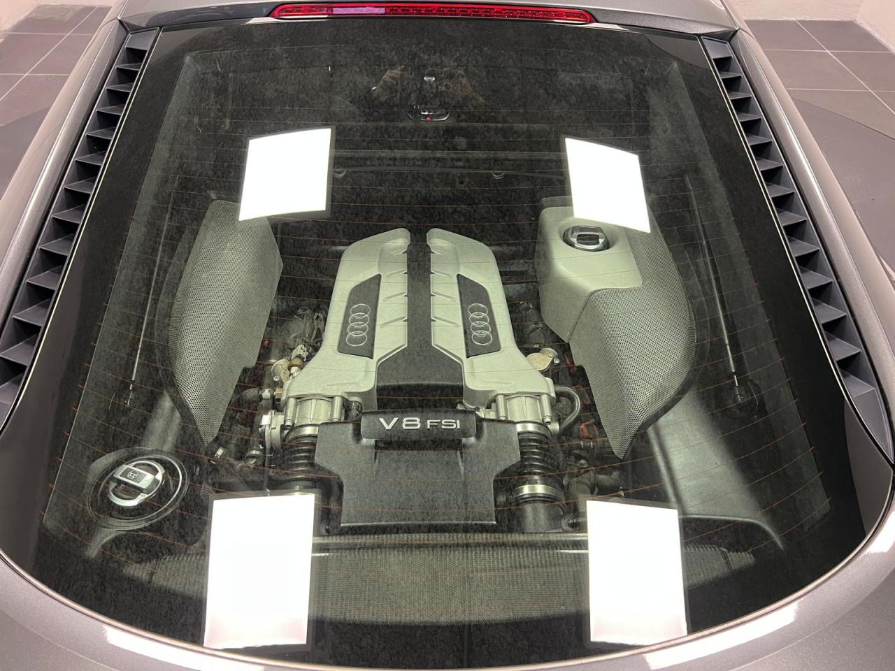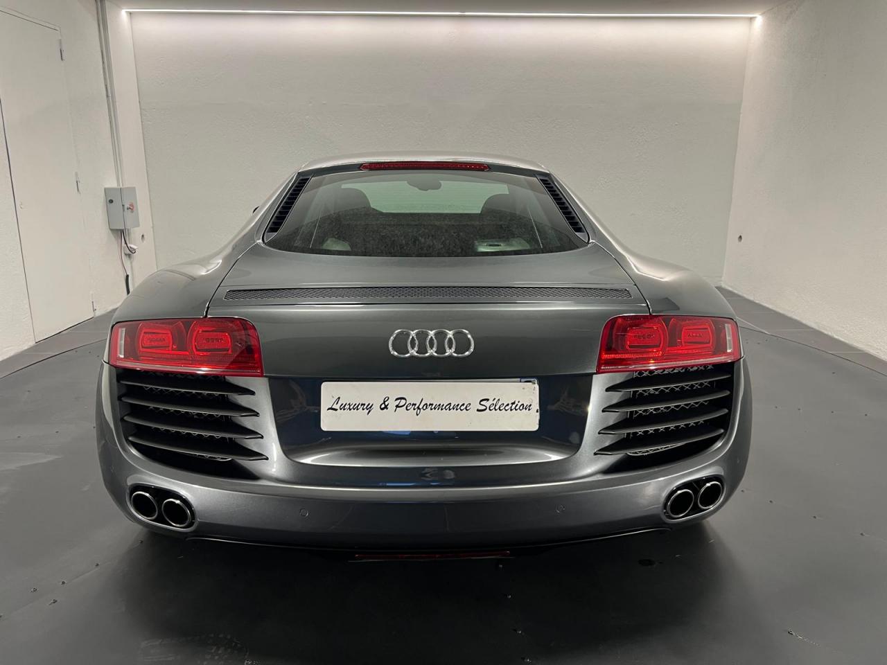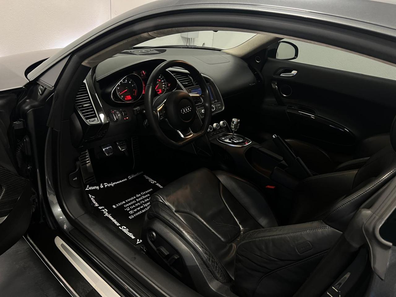 3ème feu stop arrièreAirbags grand volume pour le conducteur et le passagerAirbags latéraux (tête/thorax) à l'avant, intégrés aux dossiers des sièges ; en cas de déclenchement d'un airbag, le système déverrouille les portières, allume l'éclairage intérieur, active les feux de Airbags latéraux tête et thoraxAlarme antivol avec protection anti-remorquage, volumètrique avec sirène indépendanteAlarme antivol incluant protection volumétrique de l'habitacle et protection antiremorquage par capteur d'inclinaison désactivableAntipatinage ASR : empêche le patinage des roues motrices ; assure une motricité optimaleApplications décoratives Gris micrométalliqueAppuie-tête actifs réglables en hauteurAppuis-tête réglablesAudi Backguard, en cas de collision arrière, la conception du siège permet l'amortissement du haut du corps et le soutien plus précoce de la têteAvertisseur ''2 tons''Avertisseur deux tons sur le moyeu du volantAvertisseur deux tons, sur le volantBoîte à gants verrouillable éclairéeBoîte à gants verrouillable et éclairée avec rangement pour lunettesCalandre Singleframe laquée noir brillantCarrosserie à architecture Audi Space Frame (ASF)Carrosserie : architecture Audi Space Frame ASF. Association innovante d'aluminium et d'acier assurant une plus grande rigidité et davantage de dynamisme, de stabilité et de sécuritéCeintures AR latérales réglables en hauteurCeintures de sécurité à prétensionneurs et limiteurs de forceCeintures de sécurité AV réglables en hauteurCeintures de sécurité trois pointsCeintures de sécurité trois points à enrouleur avec prétensionneurs pyrotechniques, limiteurs de tension et réglage en hauteurCendrier et allume-cigares sur la console centraleChâssis “Sport”Châssis Sport avec réglages dynamiques de châssisCiel de pavillon en tissu noir ou gris lumièreClimatisation automatiqueCockpit de type Monoposto : arche entourant la casquette d'instrumentation et se prolongeant sur la portière conducteur et sur la console centraleColonne de direction de sécuritéColonne de direction réglable en hauteur / profondeurContrôle de la pression des pneumatiquesDéverrouillage du capot moteur, de la malle avant et de la trappe à carburant depuis la place conducteurDirection assistée électromécanique, assistance asservie à la vitesseEBV : Répartiteur électronique de freinageEclairage intérieur à extinction temporiséeEclairage intérieur à temporisation avec contacteurs sur toutes les portièresEclaireurs et catadioptres sur toutes les portièresEcrous antivolEDS (blocage électronique de différentiel)Essuie-glace à intermittence réglableEssuie-glace deux vitesses avec commande automatiqueFeux antibrouillard arrièreFeux arrière entièrement à diodes, feux stop, troisième feu stop, clignotants, feux arrière et feu arrière de brouillard sous verre transparent, feux de recul et clignotants blancsFeux de jour à LEDFixation Isofix pour siege passager AVFrein à main mécaniqueFreinage : étriers fixes à huit pistons à l'avant et à quatre pistons à l'arrière, cartographie de servofrein adaptée, disques de freinage ajourés et ventilés à l'avant et à l'arrière, en deux parGrille de boîte de vitesses manuelle en H, en acieridSAT : système d'immobilisation et de localisation par satelliteInscription R8 à l'arrière du véhicule et sur le compte-toursInstrumentation R8 spécifique gris micrométallique à éclairage réglableJantes en aluminium coulé style 6 branches, 8,5 J x 18” avec pneus 235/40 R 18 à l'avant, et jantes 10,5 J x 18” avec pneus 285/35 R 18 à l'arrièreLave-pharesLave-phares haute pressionLivre de bord avec étui en AlcantaraLivre de bord avec étui en cuirLunette arrière dégivrante avec minuterie et antenne de vitre intégréeMMI Unité de commande des réglages du véhicule , de la radio, du GPS Plus (en option), du changeur 6 CD (en option) et de la préparation téléphone Bluetooth (en option)Moquette et tapis complémentaires en velours, couleur assortie à celle de l'habitacleMoulures de seuils de portes avec insert d'aluminium et inscription R8Outillage de bord dans le coffrePare-brise athermique en verre feuilleté avec bande grise sur la partie supérieurePare-brise en verre athermique feuilleté avec bande de couleur grise sur la partie supérieurePare-chocs enrobés de synthétique dans la couleur de la carrosseriePare-soleil gauche et droite rabattables et orientables avec miroir de courtoisie éclairéPare-soleil rabattables et pivotants, côtés conducteur et passager avant, avec miroir de courtoisie occultablePlafonnier à temporisation avec contacteur sur toutes les portières ; éclairage côté passager avant et dans le coffrePommeau de levier de vitesses en aluminiumPommeau de levier de vitesses en aluminium avec anneau décoratif style aluminiumPorte-boissons, double dans la console centralePrise 12 V dans la boîte à gants et le coffrePrise 12V dans le coffreProgramme de stabilité électronique (ESP)Projecteurs antibrouillards en verre transparent, projecteurs halogènes intégrés dans le bouclier AVProjecteurs au Xénon, lave phares et réglage de site des phares automatiqueProtection anticollision latérale dans les portières, constituée de profilés d'aluminium rigidesProtection antidémarrage électronique avec code modifiable, activation automatique par clé de contactProtection latérale anticollisionQuattro, transmission intégrale permanente augmentant la motricité et la sécurité activeRétroviseur intérieur jour et nuitRétroviseur intérieur jour/nuit manuelRétroviseurs extérieurs électriquement, asphérique à gauche, convexe à droite, boîtiers laqués dans la couleur de carrosserie, avec clignotants latéraux à diodes intégrésRétroviseurs extérieurs électriques et dégivrants, asphérique à gauche, convexe à droite, boîtiers laqués dans la couleur de carrosserie, avec clignotants latéraux à diodes 