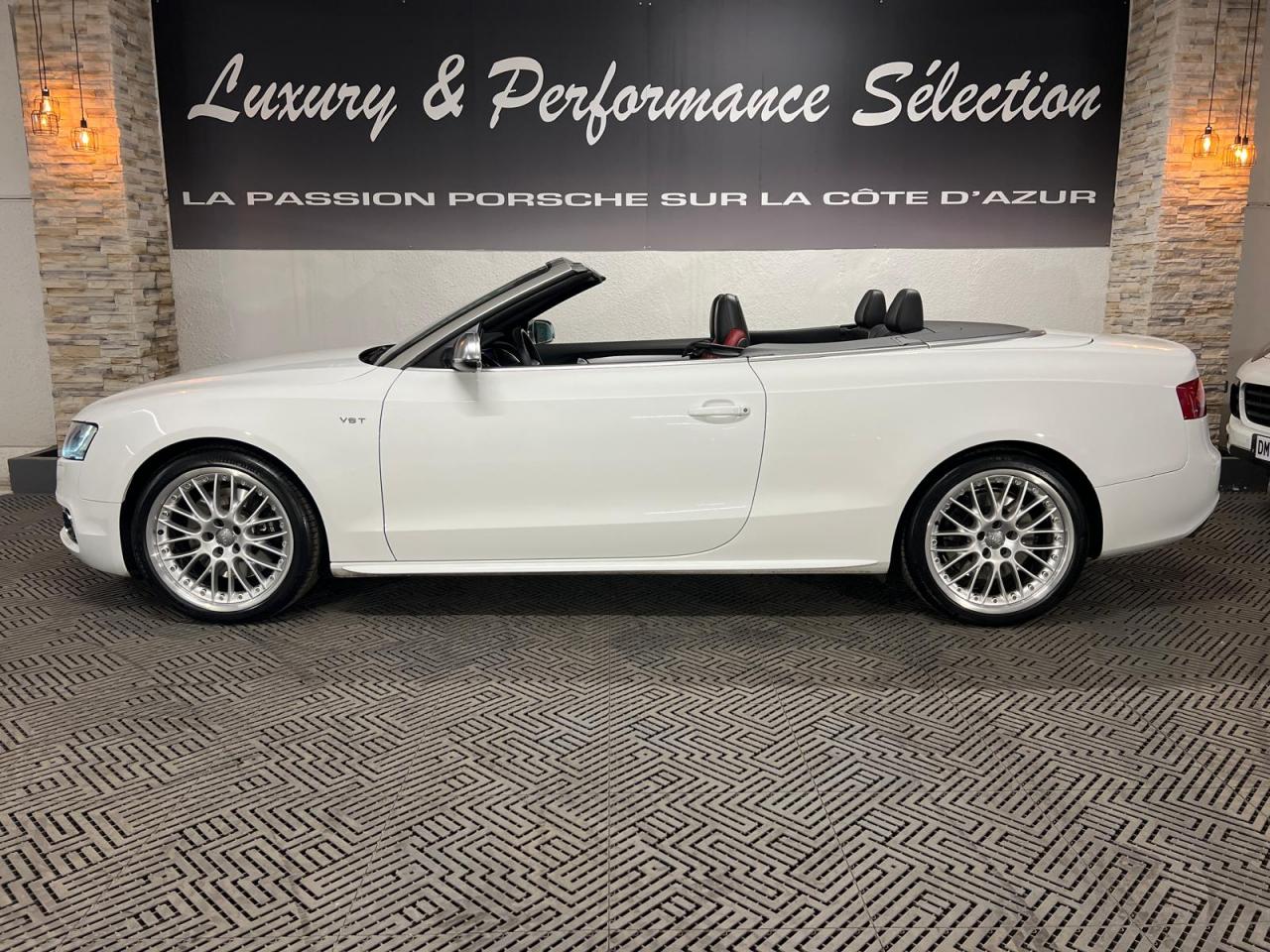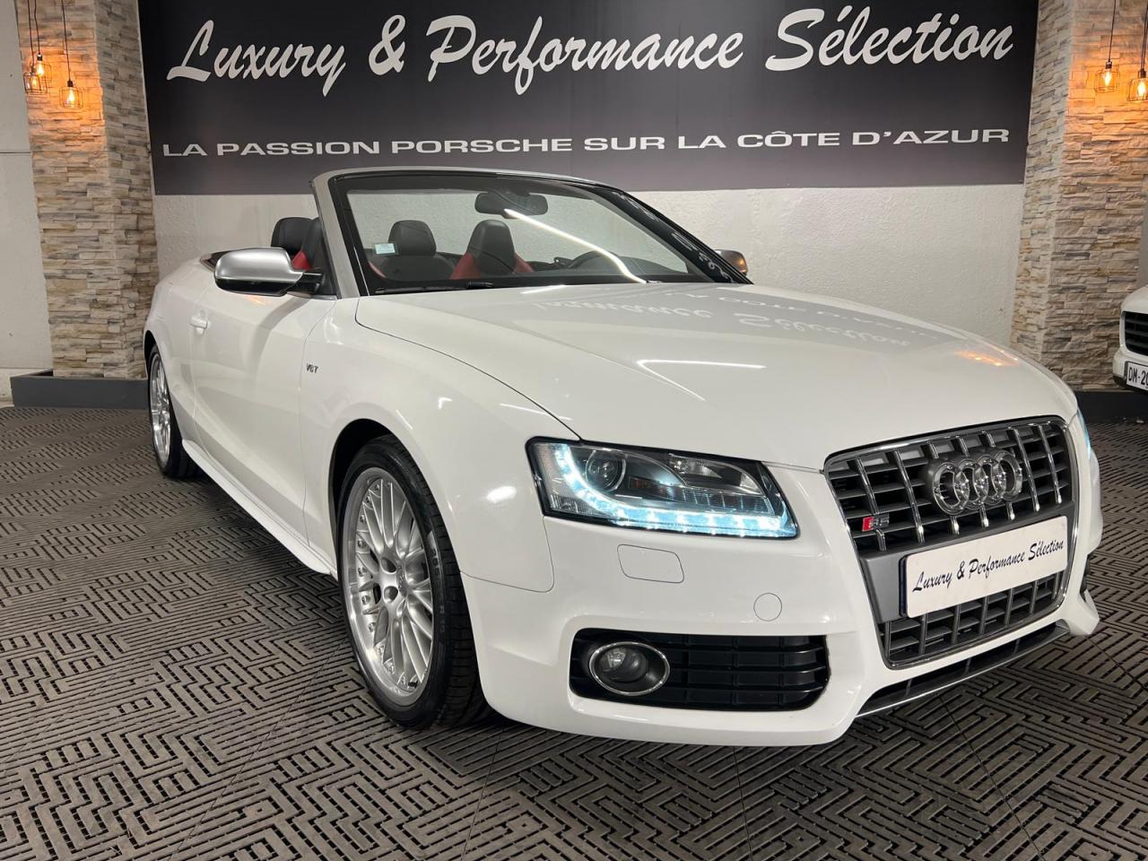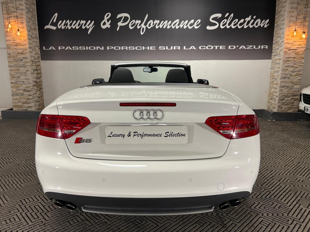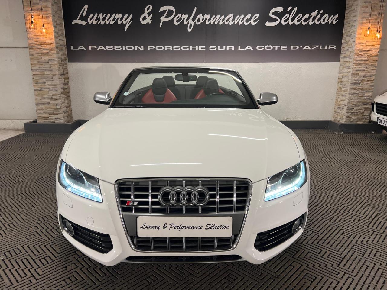 Accoudoir central avant avec vide-poches et 2 prises 12 VAirbags grand volume pour le conducteur et le passagerAirbags latérauxAllume-cigare intégré dans le cendrierAntipatinage ASR : empêche le patinage des roues motrices ; assure une motricité optimaleApplications décoratives en aluminium brossé mat sur les contre-portes, les garnitures latérales à l'arrière ainsi que sur la console centraleAppuie-têtes, à l'avant et à l'arrière, réglables en hauteur à l'avantArceaux de sécurité actifs : système de protection à déclenchement automatique situé derrière les appuie-têtes arrièreAudi Hold Assist : système désactivable maintenant le véhicule à l'arrêt en descente comme en côte; permet un redémarrage confortable sans mettre le frein à mainAvance-ceinture automatique, avec deux positions pour personnes de taille différente. La ceinture avance automatiquement au démarrage du moteur et reprend sa place initiale une fois enclenchéeAvertisseur deux tons sur le moyeu du volantBlocage électronique de différentiel (EDS)Boîte à gants verrouillableCalandre Singleframe gris platine avec entretoises verticales chroméesCapote entièrement automatique, en tissu isolant 3 couches, pouvant être activée jusqu'à 50 km/hCarrosserie galvanisée, autoportante, soudée au groupe plancherCeintures de sécurité, automatiques à trois points pour les quatre placesCendrier, sur la console centrale avantChâssis DynamiqueChâssis Sport spécifique S : suspension réglée pour un contact plus direct avec la route et un comportement sportifCiel de capote en tissu, couleur au choix argent ou noirClimatisation automatique Confort Plus 3 zonesColonne de direction de sécuritéContact d'allumage électronique, clé de contact mémorisant différentes données d'entretienCric de levageDétecteur de pluie et allumage automatique des projecteursDirection assistée ServotronicDossiers de banquette arrière rabattables 50/50Eclairage intérieur à extinction temporisée et contacteurs sur toutes les portièresEcran 7” couleur sur le tableau de bord pour l'affichage des fonctions radio, climatisation et menu du véhicule, ainsi que de l'heureEcrous antivolEssuie-glace deux vitesses avec commande automatiqueExtensions de bas de caisse couleur carrosserieFeux arrière à diode pour feux de stop et feux de position ; feux de recul, feux antibrouillard et clignotant à ampoulesFeux de route assistés : gestion automatique du passage de feux de croisement à pleins phares et inversementFilet anti-remousFilets de rangement au dos des sièges avantFixation pour sièges enfants ISOFIX à l'arrièreFrein de stationnement electromécaniqueGPS Advanced : système de navigation MMI de troisième générationidSAT : système d'immobilisation et de localisation par satelliteIndicateur d'usure des garnitures de freinIndicateur de température extérieure dans le système d'information du conducteurInstrumentation, avec éclairage réglable, compteur de vitesse électronique avec compteur kilométrique et compteur journalier, compte-tours, horloge, affichage de la température du liquide de refroidissement et jauge de carburantJantes en aluminium coulé style S 5 branches doubles, 8,5 J x 18”, avec pneus 245/40 R18Lève-vitres électriques à l'avant avec protection antipincement, fonction ouverture/fermeture confort par impulsions ; vitres arrière fixesLimiteurs d'effort des ceintures de sécurité avantLogement de capote à configuration variable, avec caisson de capote abaissable automatiquement lors de l'ouverture de la capote. Lors du chargement, le caisson peut être relevé si la capote est ferméeLunette arrière dégivrante, avec minuterieOrdinateur de bord couleur et contrôle AutocheckOutillage de bord dans le coffrePack AluminiumPack EclairagePoignées de portes couleur carrosseriePorte-boissons sur la console centrale, 2 porte-boissons et volet roulant, intégré au centre de la banquette arrièrePréparation pour téléphone 2 W bi-bande (D et E)Prétensionneurs sur les ceintures avant et arrièrePrise 12V dans le coffreProgramme de stabilité électronique (ESP)Projecteurs antibrouillardProtection antidémarrage électroniqueProtection contre l'échauffement : la pigmentation spéciale empêche la sellerie de trop s'échauffer ; les rayons infrarouges contenus dans la lumière du soleil sont reflétésQuatre oeilletons de fixation, pour maintenir les bagages et objets dans le coffre, points de suspension pour le filet mixteQuattro : transmission intégrale permanente avec répartition asymétrique et dynamique de coupleRéglage d'appuis lombaires électriques sur 4 plans pour sièges avantRégulateur de vitesseRétroviseur intérieur électrochromeRétroviseurs extérieurs dégivrants avec clignotant latéral intégré à diodes, réglable électriquement ; boîtiers style aluminium, miroir asphériqueRoue de secours temporaireSellerie mixte cuir/alcantaraSeuils de porte avec insert en aluminium et inscription S5Sièges avant électriques pour longueur, hauteur, inclinaison d'assise et de dossierSièges avant Sport avec repose cuisse réglable en longueurSorties d'échappement, visible, double, deux sorties ovales à gauche et à droiteStyle aluminium, dans l'habitacle sur les commutateurs d'éclairage, la commande de climatisation, la commande MMI, les diffuseurs d'air et autour du levier de vitessesSystème acoustique d'aide au stationnement arrièreSystème antiblocage ABS avec répartiteur de freinage EBV, programme électronique de stabilisation ESP avec amplificateur hydraulique de freinage d'urgenceSystème audiophonique AudiSystème d'appuie-tête intégralSystème d'information du conducteur avec affichage couleur : fournit à l'écran les informations de l'ordinateur de bord et du contrôle Autocheck, certaines informations du système MMI, l'indicateur du rapport de vitesse ainsi que l'affichageTapis complémentaires en velours à l'avant, assortis à la couleur de la mo