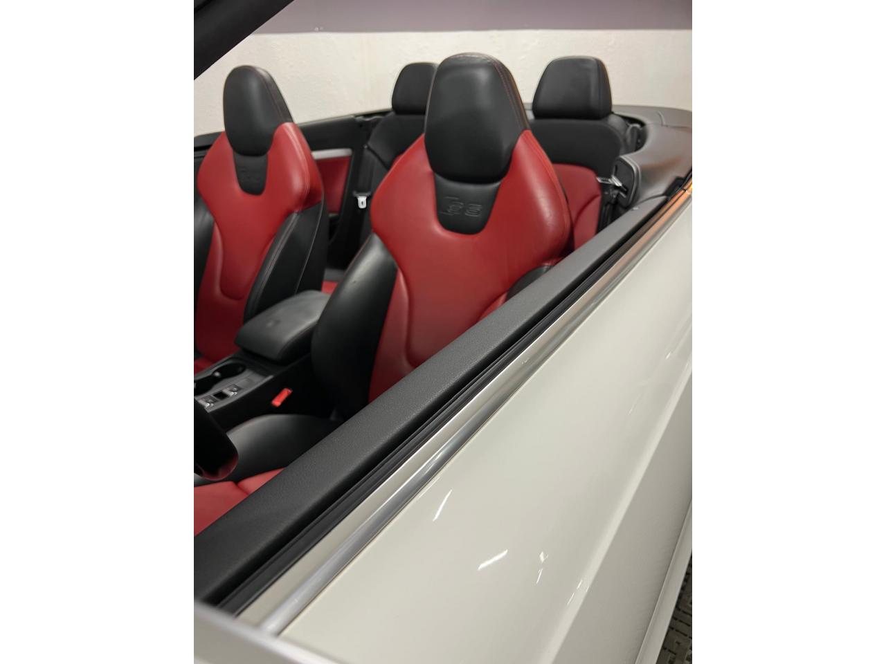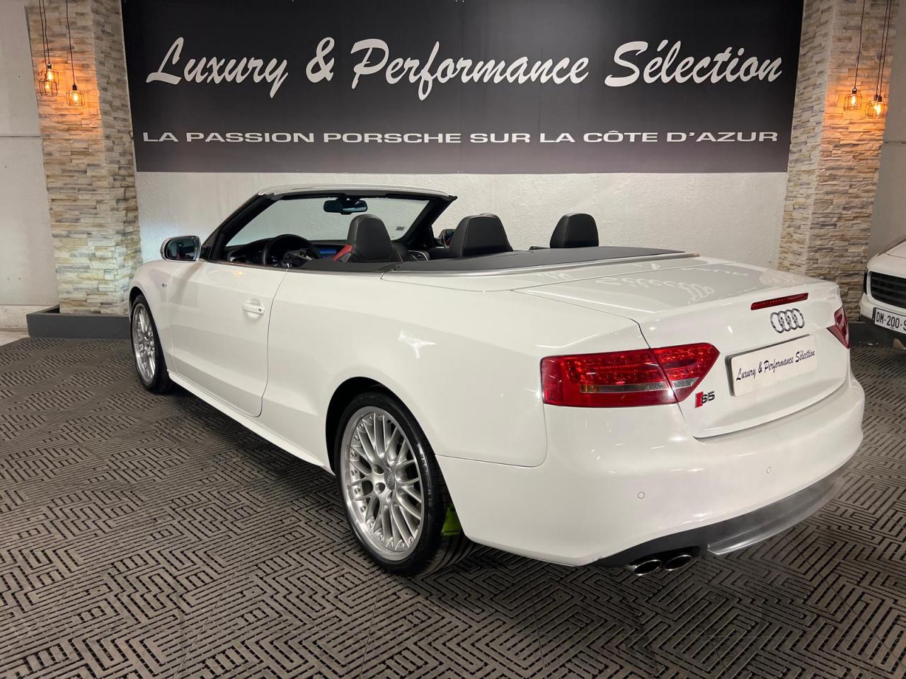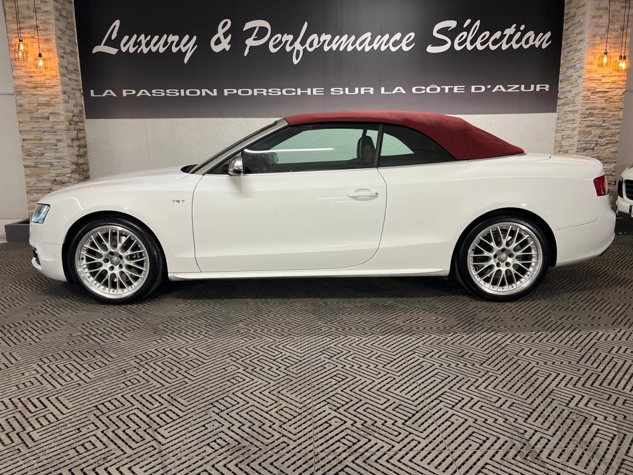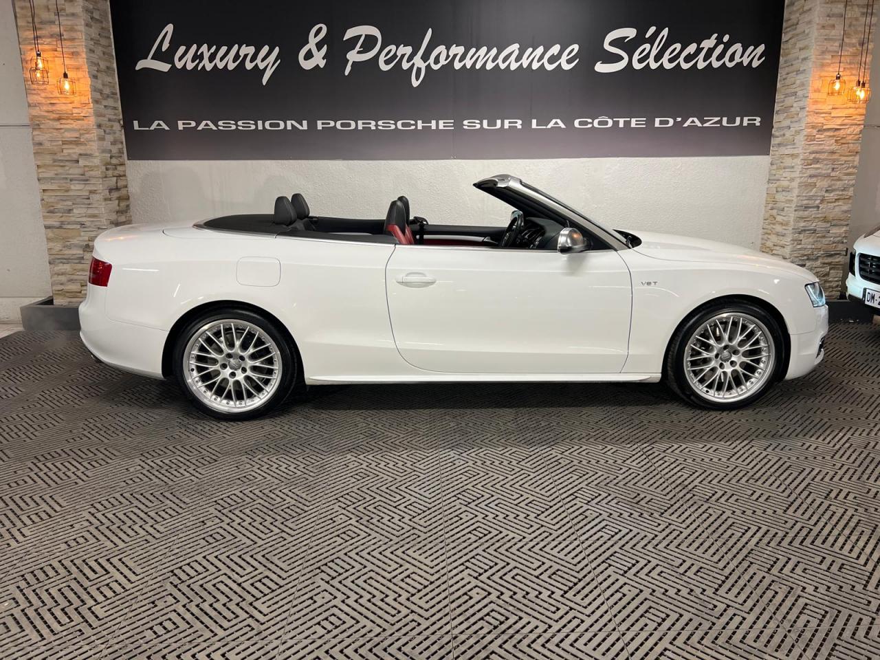 Accoudoir central avant avec vide-poches et 2 prises 12 VAirbags grand volume pour le conducteur et le passagerAirbags latérauxAllume-cigare intégré dans le cendrierAntipatinage ASR : empêche le patinage des roues motrices ; assure une motricité optimaleApplications décoratives en aluminium brossé mat sur les contre-portes, les garnitures latérales à l'arrière ainsi que sur la console centraleAppuie-têtes, à l'avant et à l'arrière, réglables en hauteur à l'avantArceaux de sécurité actifs : système de protection à déclenchement automatique situé derrière les appuie-têtes arrièreAudi Hold Assist : système désactivable maintenant le véhicule à l'arrêt en descente comme en côte; permet un redémarrage confortable sans mettre le frein à mainAvance-ceinture automatique, avec deux positions pour personnes de taille différente. La ceinture avance automatiquement au démarrage du moteur et reprend sa place initiale une fois enclenchéeAvertisseur deux tons sur le moyeu du volantBlocage électronique de différentiel (EDS)Boîte à gants verrouillableCalandre Singleframe gris platine avec entretoises verticales chroméesCapote entièrement automatique, en tissu isolant 3 couches, pouvant être activée jusqu'à 50 km/hCarrosserie galvanisée, autoportante, soudée au groupe plancherCeintures de sécurité, automatiques à trois points pour les quatre placesCendrier, sur la console centrale avantChâssis DynamiqueChâssis Sport spécifique S : suspension réglée pour un contact plus direct avec la route et un comportement sportifCiel de capote en tissu, couleur au choix argent ou noirClimatisation automatique Confort Plus 3 zonesColonne de direction de sécuritéContact d'allumage électronique, clé de contact mémorisant différentes données d'entretienCric de levageDétecteur de pluie et allumage automatique des projecteursDirection assistée ServotronicDossiers de banquette arrière rabattables 50/50Eclairage intérieur à extinction temporisée et contacteurs sur toutes les portièresEcran 7” couleur sur le tableau de bord pour l'affichage des fonctions radio, climatisation et menu du véhicule, ainsi que de l'heureEcrous antivolEssuie-glace deux vitesses avec commande automatiqueExtensions de bas de caisse couleur carrosserieFeux arrière à diode pour feux de stop et feux de position ; feux de recul, feux antibrouillard et clignotant à ampoulesFeux de route assistés : gestion automatique du passage de feux de croisement à pleins phares et inversementFilet anti-remousFilets de rangement au dos des sièges avantFixation pour sièges enfants ISOFIX à l'arrièreFrein de stationnement electromécaniqueGPS Advanced : système de navigation MMI de troisième générationidSAT : système d'immobilisation et de localisation par satelliteIndicateur d'usure des garnitures de freinIndicateur de température extérieure dans le système d'information du conducteurInstrumentation, avec éclairage réglable, compteur de vitesse électronique avec compteur kilométrique et compteur journalier, compte-tours, horloge, affichage de la température du liquide de refroidissement et jauge de carburantJantes en aluminium coulé style S 5 branches doubles, 8,5 J x 18”, avec pneus 245/40 R18Lève-vitres électriques à l'avant avec protection antipincement, fonction ouverture/fermeture confort par impulsions ; vitres arrière fixesLimiteurs d'effort des ceintures de sécurité avantLogement de capote à configuration variable, avec caisson de capote abaissable automatiquement lors de l'ouverture de la capote. Lors du chargement, le caisson peut être relevé si la capote est ferméeLunette arrière dégivrante, avec minuterieOrdinateur de bord couleur et contrôle AutocheckOutillage de bord dans le coffrePack AluminiumPack EclairagePoignées de portes couleur carrosseriePorte-boissons sur la console centrale, 2 porte-boissons et volet roulant, intégré au centre de la banquette arrièrePréparation pour téléphone 2 W bi-bande (D et E)Prétensionneurs sur les ceintures avant et arrièrePrise 12V dans le coffreProgramme de stabilité électronique (ESP)Projecteurs antibrouillardProtection antidémarrage électroniqueProtection contre l'échauffement : la pigmentation spéciale empêche la sellerie de trop s'échauffer ; les rayons infrarouges contenus dans la lumière du soleil sont reflétésQuatre oeilletons de fixation, pour maintenir les bagages et objets dans le coffre, points de suspension pour le filet mixteQuattro : transmission intégrale permanente avec répartition asymétrique et dynamique de coupleRéglage d'appuis lombaires électriques sur 4 plans pour sièges avantRégulateur de vitesseRétroviseur intérieur électrochromeRétroviseurs extérieurs dégivrants avec clignotant latéral intégré à diodes, réglable électriquement ; boîtiers style aluminium, miroir asphériqueRoue de secours temporaireSellerie mixte cuir/alcantaraSeuils de porte avec insert en aluminium et inscription S5Sièges avant électriques pour longueur, hauteur, inclinaison d'assise et de dossierSièges avant Sport avec repose cuisse réglable en longueurSorties d'échappement, visible, double, deux sorties ovales à gauche et à droiteStyle aluminium, dans l'habitacle sur les commutateurs d'éclairage, la commande de climatisation, la commande MMI, les diffuseurs d'air et autour du levier de vitessesSystème acoustique d'aide au stationnement arrièreSystème antiblocage ABS avec répartiteur de freinage EBV, programme électronique de stabilisation ESP avec amplificateur hydraulique de freinage d'urgenceSystème audiophonique AudiSystème d'appuie-tête intégralSystème d'information du conducteur avec affichage couleur : fournit à l'écran les informations de l'ordinateur de bord et du contrôle Autocheck, certaines informations du système MMI, l'indicateur du rapport de vitesse ainsi que l'affichageTapis complémentaires en velours à l'avant, assortis à la couleur de la mo
