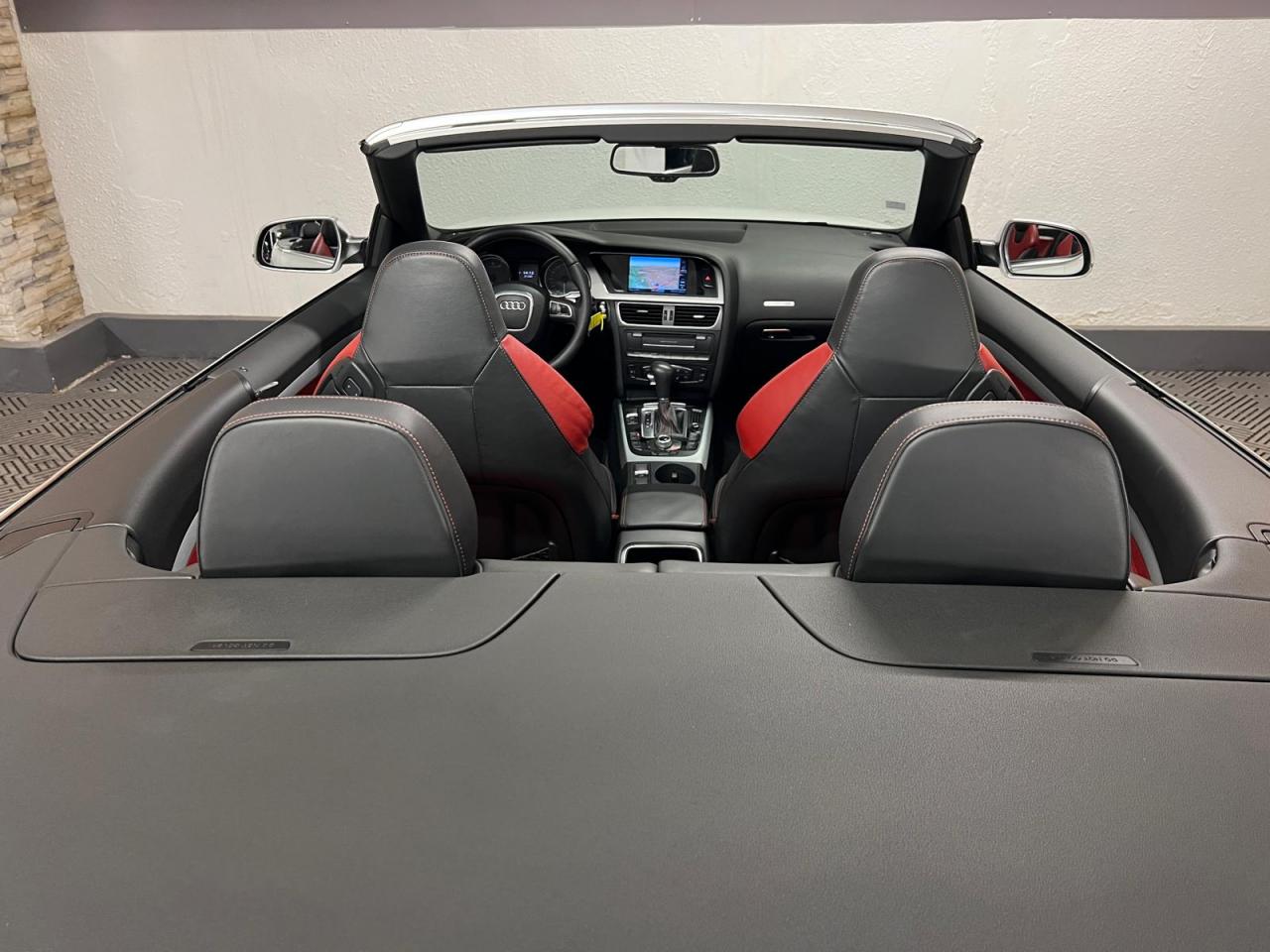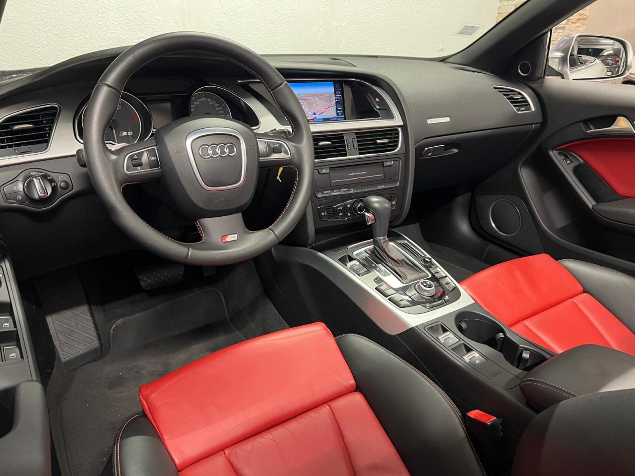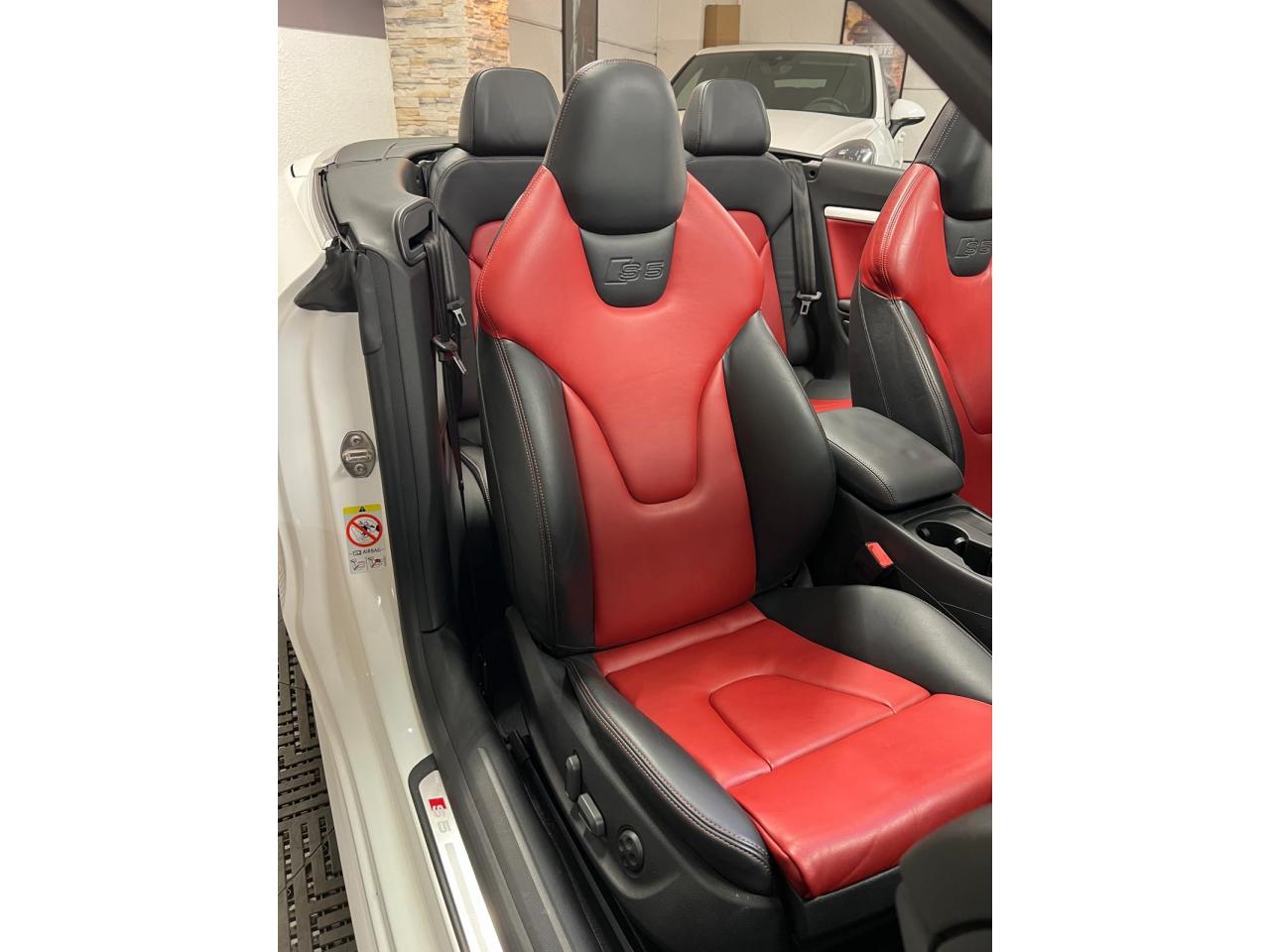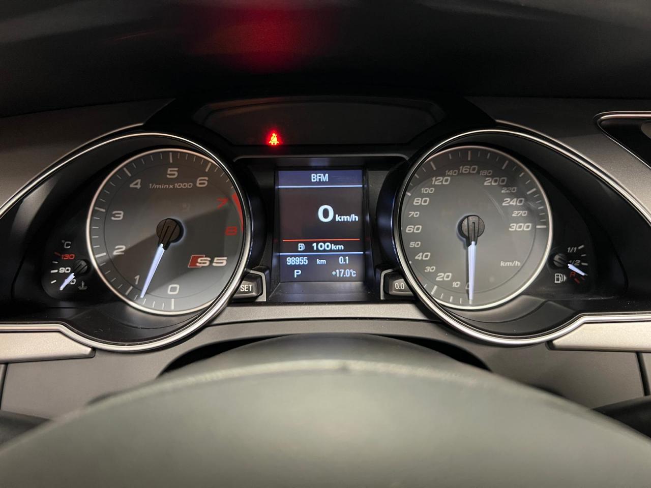 Accoudoir central avant avec vide-poches et 2 prises 12 VAirbags grand volume pour le conducteur et le passagerAirbags latérauxAllume-cigare intégré dans le cendrierAntipatinage ASR : empêche le patinage des roues motrices ; assure une motricité optimaleApplications décoratives en aluminium brossé mat sur les contre-portes, les garnitures latérales à l'arrière ainsi que sur la console centraleAppuie-têtes, à l'avant et à l'arrière, réglables en hauteur à l'avantArceaux de sécurité actifs : système de protection à déclenchement automatique situé derrière les appuie-têtes arrièreAudi Hold Assist : système désactivable maintenant le véhicule à l'arrêt en descente comme en côte; permet un redémarrage confortable sans mettre le frein à mainAvance-ceinture automatique, avec deux positions pour personnes de taille différente. La ceinture avance automatiquement au démarrage du moteur et reprend sa place initiale une fois enclenchéeAvertisseur deux tons sur le moyeu du volantBlocage électronique de différentiel (EDS)Boîte à gants verrouillableCalandre Singleframe gris platine avec entretoises verticales chroméesCapote entièrement automatique, en tissu isolant 3 couches, pouvant être activée jusqu'à 50 km/hCarrosserie galvanisée, autoportante, soudée au groupe plancherCeintures de sécurité, automatiques à trois points pour les quatre placesCendrier, sur la console centrale avantChâssis DynamiqueChâssis Sport spécifique S : suspension réglée pour un contact plus direct avec la route et un comportement sportifCiel de capote en tissu, couleur au choix argent ou noirClimatisation automatique Confort Plus 3 zonesColonne de direction de sécuritéContact d'allumage électronique, clé de contact mémorisant différentes données d'entretienCric de levageDétecteur de pluie et allumage automatique des projecteursDirection assistée ServotronicDossiers de banquette arrière rabattables 50/50Eclairage intérieur à extinction temporisée et contacteurs sur toutes les portièresEcran 7” couleur sur le tableau de bord pour l'affichage des fonctions radio, climatisation et menu du véhicule, ainsi que de l'heureEcrous antivolEssuie-glace deux vitesses avec commande automatiqueExtensions de bas de caisse couleur carrosserieFeux arrière à diode pour feux de stop et feux de position ; feux de recul, feux antibrouillard et clignotant à ampoulesFeux de route assistés : gestion automatique du passage de feux de croisement à pleins phares et inversementFilet anti-remousFilets de rangement au dos des sièges avantFixation pour sièges enfants ISOFIX à l'arrièreFrein de stationnement electromécaniqueGPS Advanced : système de navigation MMI de troisième générationidSAT : système d'immobilisation et de localisation par satelliteIndicateur d'usure des garnitures de freinIndicateur de température extérieure dans le système d'information du conducteurInstrumentation, avec éclairage réglable, compteur de vitesse électronique avec compteur kilométrique et compteur journalier, compte-tours, horloge, affichage de la température du liquide de refroidissement et jauge de carburantJantes en aluminium coulé style S 5 branches doubles, 8,5 J x 18”, avec pneus 245/40 R18Lève-vitres électriques à l'avant avec protection antipincement, fonction ouverture/fermeture confort par impulsions ; vitres arrière fixesLimiteurs d'effort des ceintures de sécurité avantLogement de capote à configuration variable, avec caisson de capote abaissable automatiquement lors de l'ouverture de la capote. Lors du chargement, le caisson peut être relevé si la capote est ferméeLunette arrière dégivrante, avec minuterieOrdinateur de bord couleur et contrôle AutocheckOutillage de bord dans le coffrePack AluminiumPack EclairagePoignées de portes couleur carrosseriePorte-boissons sur la console centrale, 2 porte-boissons et volet roulant, intégré au centre de la banquette arrièrePréparation pour téléphone 2 W bi-bande (D et E)Prétensionneurs sur les ceintures avant et arrièrePrise 12V dans le coffreProgramme de stabilité électronique (ESP)Projecteurs antibrouillardProtection antidémarrage électroniqueProtection contre l'échauffement : la pigmentation spéciale empêche la sellerie de trop s'échauffer ; les rayons infrarouges contenus dans la lumière du soleil sont reflétésQuatre oeilletons de fixation, pour maintenir les bagages et objets dans le coffre, points de suspension pour le filet mixteQuattro : transmission intégrale permanente avec répartition asymétrique et dynamique de coupleRéglage d'appuis lombaires électriques sur 4 plans pour sièges avantRégulateur de vitesseRétroviseur intérieur électrochromeRétroviseurs extérieurs dégivrants avec clignotant latéral intégré à diodes, réglable électriquement ; boîtiers style aluminium, miroir asphériqueRoue de secours temporaireSellerie mixte cuir/alcantaraSeuils de porte avec insert en aluminium et inscription S5Sièges avant électriques pour longueur, hauteur, inclinaison d'assise et de dossierSièges avant Sport avec repose cuisse réglable en longueurSorties d'échappement, visible, double, deux sorties ovales à gauche et à droiteStyle aluminium, dans l'habitacle sur les commutateurs d'éclairage, la commande de climatisation, la commande MMI, les diffuseurs d'air et autour du levier de vitessesSystème acoustique d'aide au stationnement arrièreSystème antiblocage ABS avec répartiteur de freinage EBV, programme électronique de stabilisation ESP avec amplificateur hydraulique de freinage d'urgenceSystème audiophonique AudiSystème d'appuie-tête intégralSystème d'information du conducteur avec affichage couleur : fournit à l'écran les informations de l'ordinateur de bord et du contrôle Autocheck, certaines informations du système MMI, l'indicateur du rapport de vitesse ainsi que l'affichageTapis complémentaires en velours à l'avant, assortis à la couleur de la mo