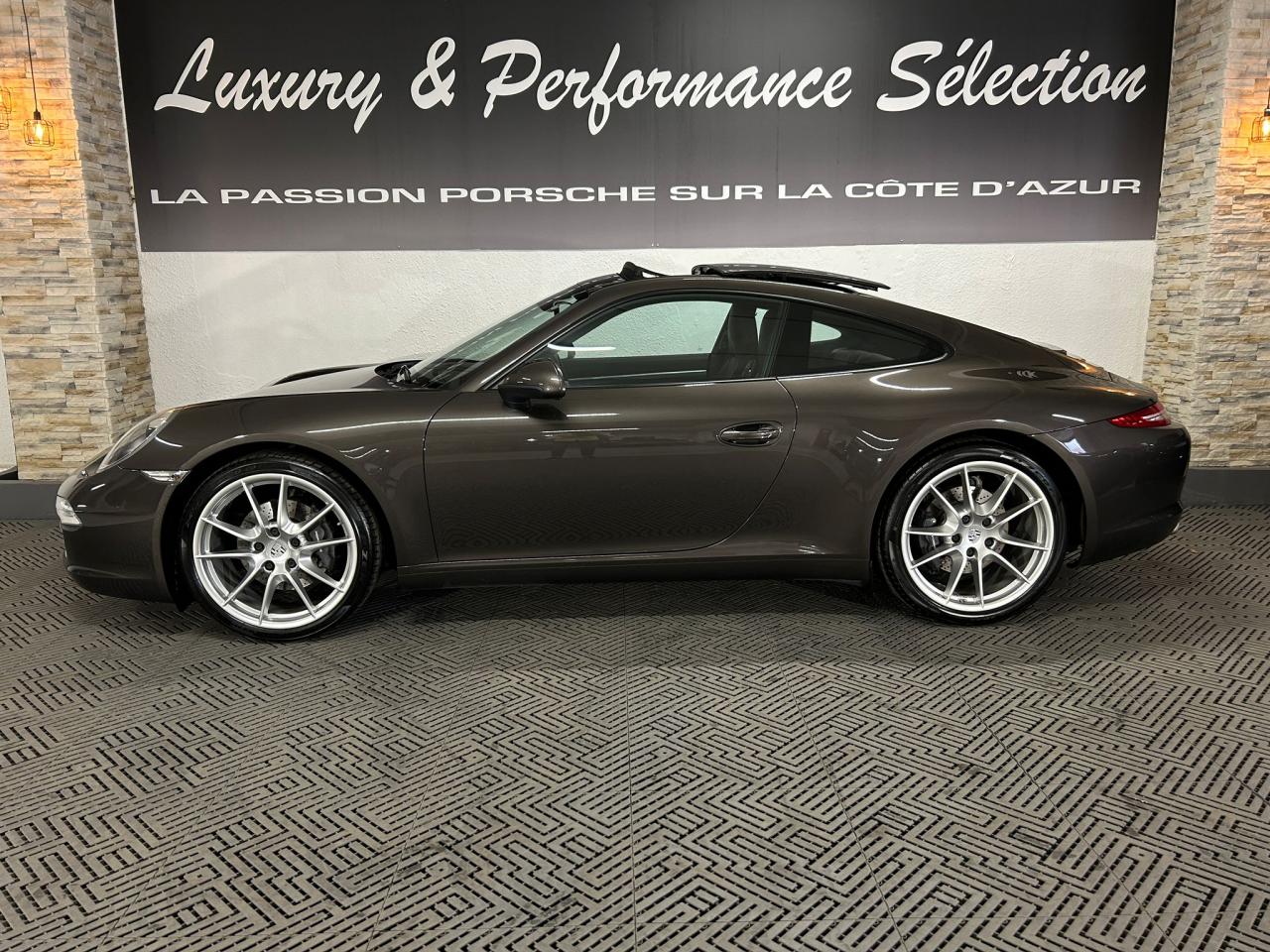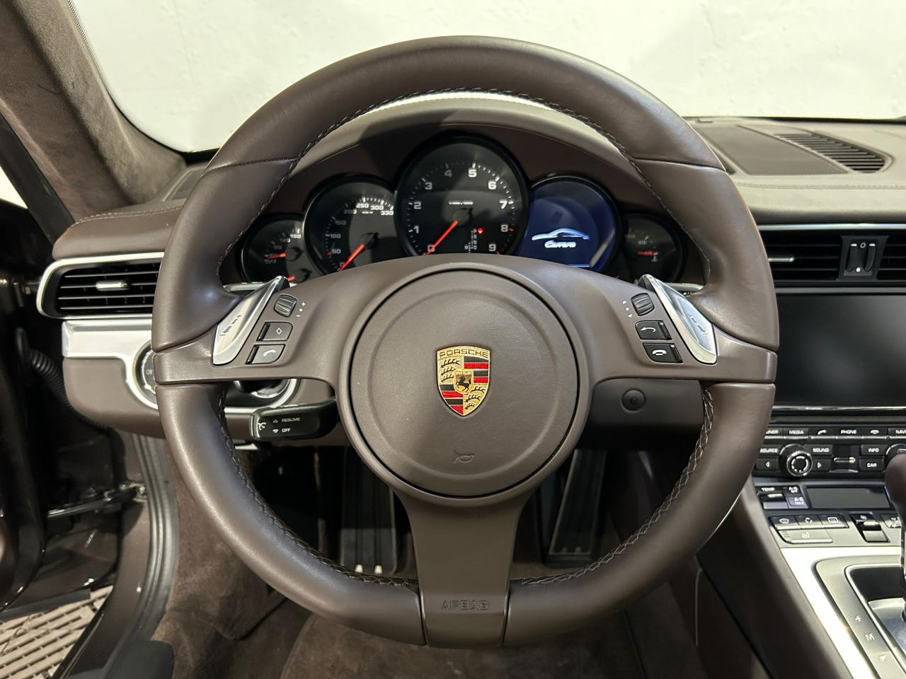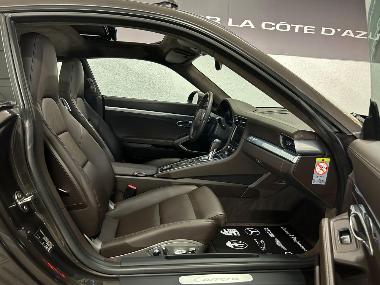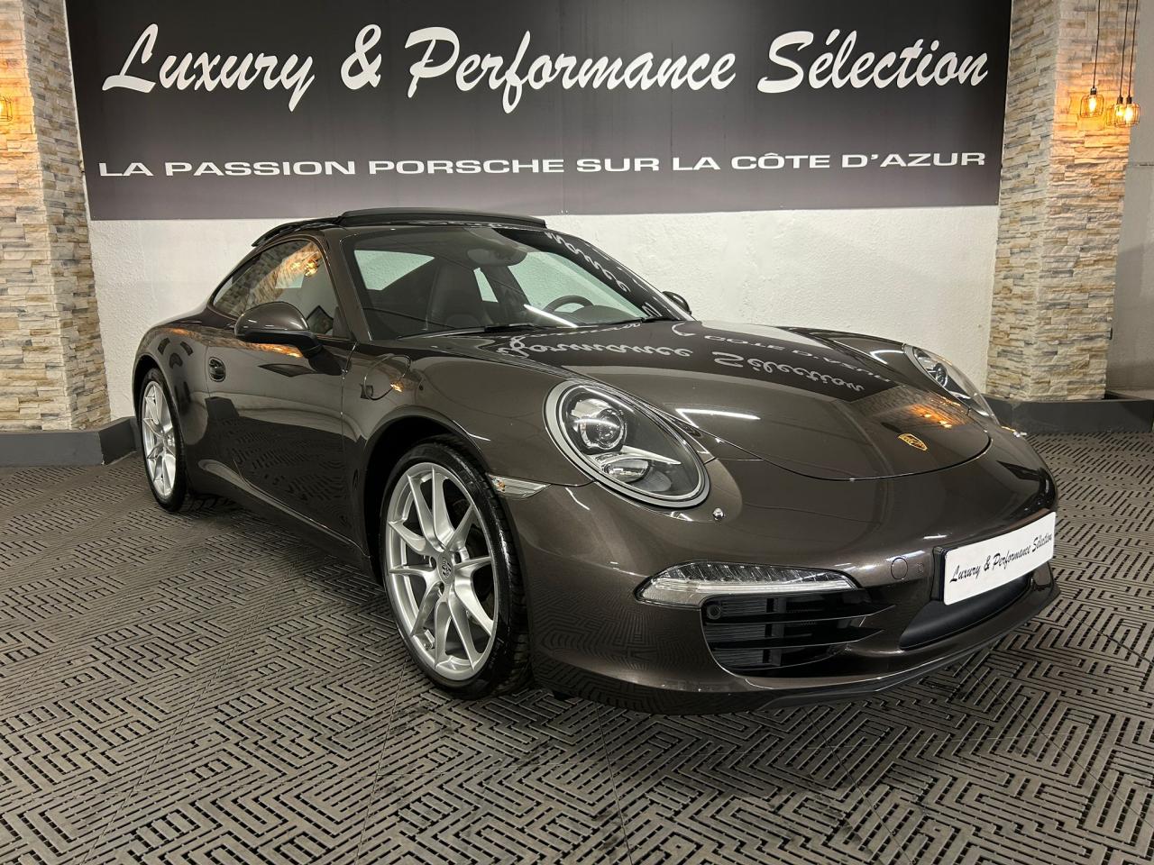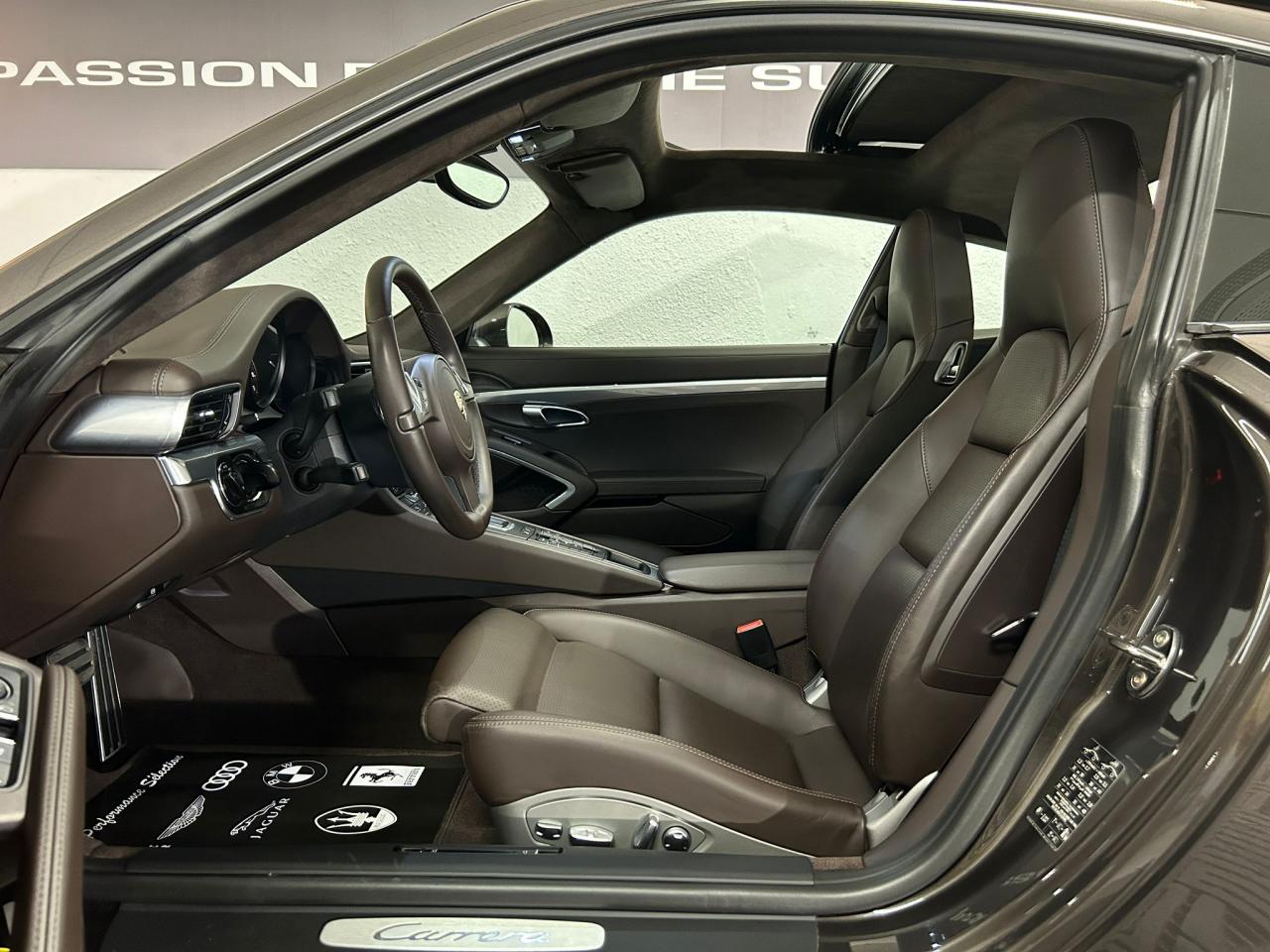 3 prises 12 V (plancher passager avant, boîte à gants, coffre de rangement de la console centrale)5 instruments ronds intégrés dans le cockpitABS (intégré au PSM)Accélérateur électroniqueAffichage analogique : régime, vitesse, pression et température de l'huile, température du liquide de refroidissement et jauge de carburantAffichage de la vitesse engagée, sur le compte-toursAileron arrière à déploiement automatiqueAirbags grand volume (deux niveaux de déclenchement) pour le conducteur et le passagerAppuie-tête intégrés aux sièges avantAssistance automatique à l'utilisation des feux de croisement comprenant l'éclairage d'accompagnementBaguettes de seuil de porte avec monogrammeBandes centrales et latérales des sièges avant et appuie-tête en cuir estampéBloc moteur et culasse en aluminiumBlocs optiques additionnels séparés, intégrés dans le bouclier avant, incluant les feux de jour et de position ainsi que les clignotants à diodes électroluminescentesBobines d allumage séparées, distribution, statique à haute tensionBoîte à gants grand volume verrouillableBouclier avant avec entrées d'air intégréesBoucliers avant et arrière déformables, avec pare-chocs intégrés (en alliage léger) fixés sur des absorbeurs de chocsCapot de coffre, portes et capot arrière en aluminiumCatadioptres intégrés au bouclier arrièreCeintures de sécurité à 3 points à l'avant et à l'arrière, boucles de ceintures sur les siègesCiel de toit et montant de lunette arrière en alcantaraClimatisation automatique bi-zone avec réglage individuel de la température pour le conducteur et le passager avant, commande automatique du recyclage de l'air avec capteur de qualité d'air et fonction chaleur résiduelleCompensation hydraulique du jeu des soupapesConcept d'éclairage blanc pour l'ensemble de l'habitacle avec rhéostat progressifConception allégée intelligente acier/aluminiumConsole centrale montante avec barrettes de commandes, un vide-poches et un coffre de rangement fermé comportant une prise 12 VCoupé 2+2 placesCouronne du volant, leviers de vitesse et de frein à main, poignées de porte, accoudoirs et coffre de rangement de la console centrale en cuir lisseCrochets porte-vêtement au dos des sièges avant et sur les montants latérauxDeux catalyseurs à 3 voiesDirection assistée électromécanique à démultiplication variable et impulsionDispositif antidémarrage avec verrouillage centralisé et télécommande, dispositif de sécurité, système d'alarme et alarme volumétriqueDispositif de contrôle de l'usure des freins sur chaque plaquetteDisques de frein de 330 mm de diamètre à l'avant et à l'arrièreÉléments en Argent galvanisé : buses d'aération, baguettes décoratives du tableau de bord, cache de la console centrale, poignée de la boîte à gants, poignées et baguettes de parement des portesEssieu arrière multibras avec barres stabilisatricesEssieu avant avec jambes de force McPherson et barres stabilisatricesEssuie-glaces avant aérodynamiques, à deux vitesses de balayage, commande intermittente réglable et buses de lave-glace chauffantesEtriers de frein noirsEtriers fixes monobloc fermés, en aluminium, à 4 pistons à l'avant et à l'arrière, disques de frein ventilés et ajourésFeux arrière comprenant les feux de recul et les clignotants, le feu antibrouillard arrière ainsi que le troisième feu stop et l'éclairage de la plaque minéralogique à diodes électroluminescentesFiltre à charbon actif retenant les particules et les pollensFonction Stop-Start automatiqueFonds de compteur (compte-tours compris) noirsFrein de parking électriqueInjection directe d'essence (Direct Fuel Injection, DFI)Interface audio universelle (AUX) logée dans la boîte à gants permettant de connecter des lecteurs audio externes (la commande s'effectue à partir du lecteur).Jantes « Carrera » 11 J x 19 pouces en alliage léger avec pneumatiques 285/35 ZR 19 à l'arrièreJantes « Carrera » 8,5 J x 19 pouces en alliage léger avec pneumatiques 235/40 ZR 19 à l'avantKit de réparation des pneus avec compresseur électriqueLève-vitres électriques à impulsion et abaissement séquentielLubrification intégrée à carter secLunette arrière chauffanteMesure de la masse d'air par capteur de pressionModule de gestion électronique du moteur (EMS SDI 9.1)Pack Audio PlusPhares Bi-Xénon avec réglage dynamique de la portée d'éclairage et lave-pharesPlaquette portant l'inscription Carrera devant le levier de vitessePompe à huile à régulation électroniquePorsche Active Suspension Management (PASM) avec abaissement du châssis de 10 mmPorsche Side Impact Protection System (POSIP) comprenant : protection anti-encastrement latérale dans les portes,airbags thorax intégrés dans les bandes extérieures des sièges avant et airbags de tête intégrés dans les contre-portes pour le condPorsche Torque Vectoring (PTV PTV Plus avec la boîte PDK optionnelle) avec différentiel arrière à glissement limité mécanique avec blocage asymétrique (22% en accélération et 27% en décélération)Pré-équipement pour l'installation en seconde monte du dispositif ISOFIX/Top-Tether destiné à fixer le siège enfant sur le siège passager avantPré-équipement pour le montage d'un système de transport sur toitPrétensionneurs de ceinture à l'avantRangement supplémentaire derrière les sièges arrièreRécupération d'énergie pour l'électronique embarquéeRefroidissement par eau, avec gestion thermique du moteur et de la boîte de vitesseRégulation sélective du cliquetisRégulation stéréo par sondes LambdaRétroviseurs extérieurs électriques chauffants, sur les portes, asphérique côté conducteurSièges arrière rabattables individuellementSièges sport avec réglage électrique des dossiers et réglage manuel de la profondeur et de la hauteur des assisesSignature Porsche et monogramme arrière (« 911 Carrera » ou « 911 Carrera S ») chromé, fi